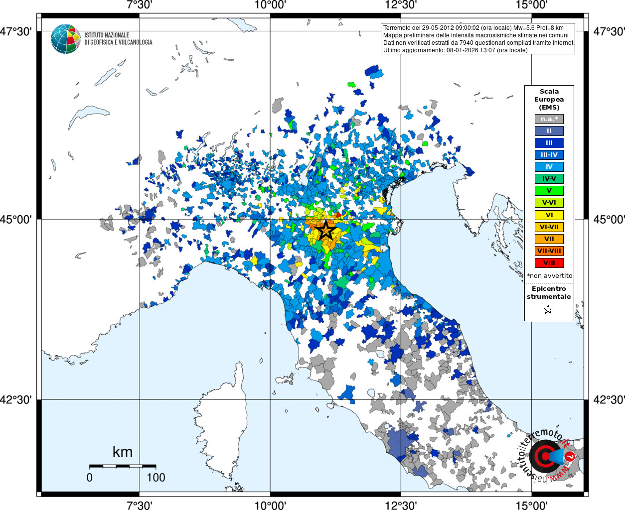 Intensità in scala europea (European Macroseismic Scale, EMS) stimata nei comuni